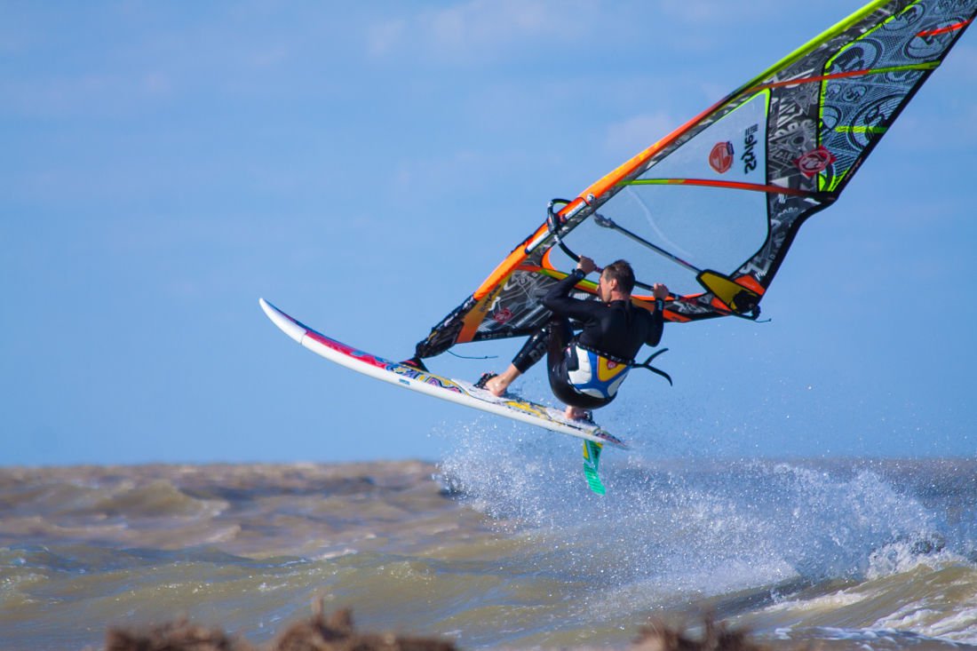 Когда дуют южные и западные ветра, команда с оборудованием перемещается на сторону косы, омываемую Таганрогским заливом. И располагается она также на пляже "Серфприюта".